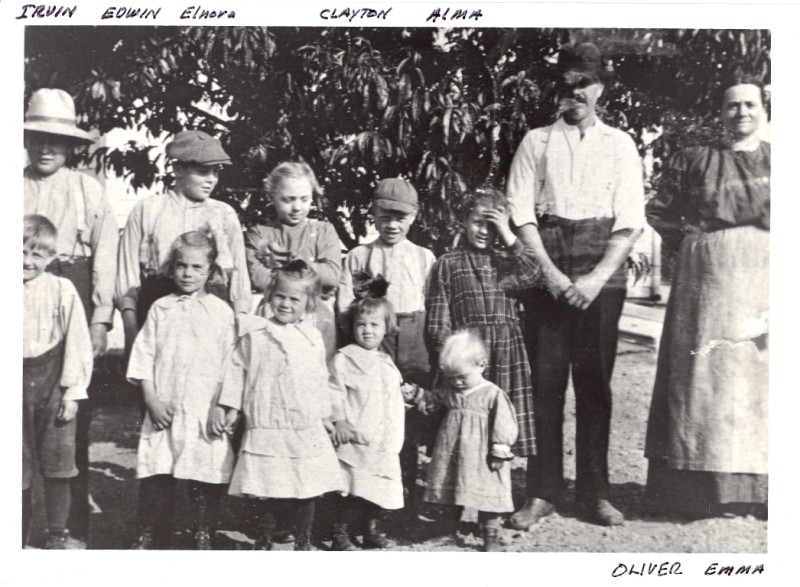 Oliver Schleicher and Emma Peters and 10 of 14 children, taken about 1915. Clayton Peters Schleicher is 4th from left in the back row. Elanor is 3rd from left in the back row. Russell is 1st on the left in the front row.