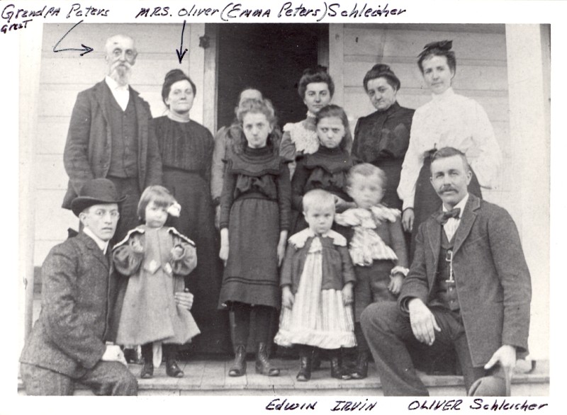The Schleicher family on front porch. Back row (l to r) Grandpa Edwin Peters, Emma Schleicher nee Peters, Harriet Peters nee Rehrig (hidden behind daughter), (the daughters are identified to the best of my knowledge l to r middle then back rows) Mabel Peters age 9, Anna Peters age 10, Mary Peters age 20, Lille Peters age 28, Carol Peters age 19. Front row (r to l) Oliver Schleicher, Irvin Schleicher, Edwin Schleicher, undentified girl (probably Smith) man identified as Mr Smith. Carol Peters is identified as Mrs Smith, I have not yet proven her marriage to Mr Smith. Taken circa 1903-1904.